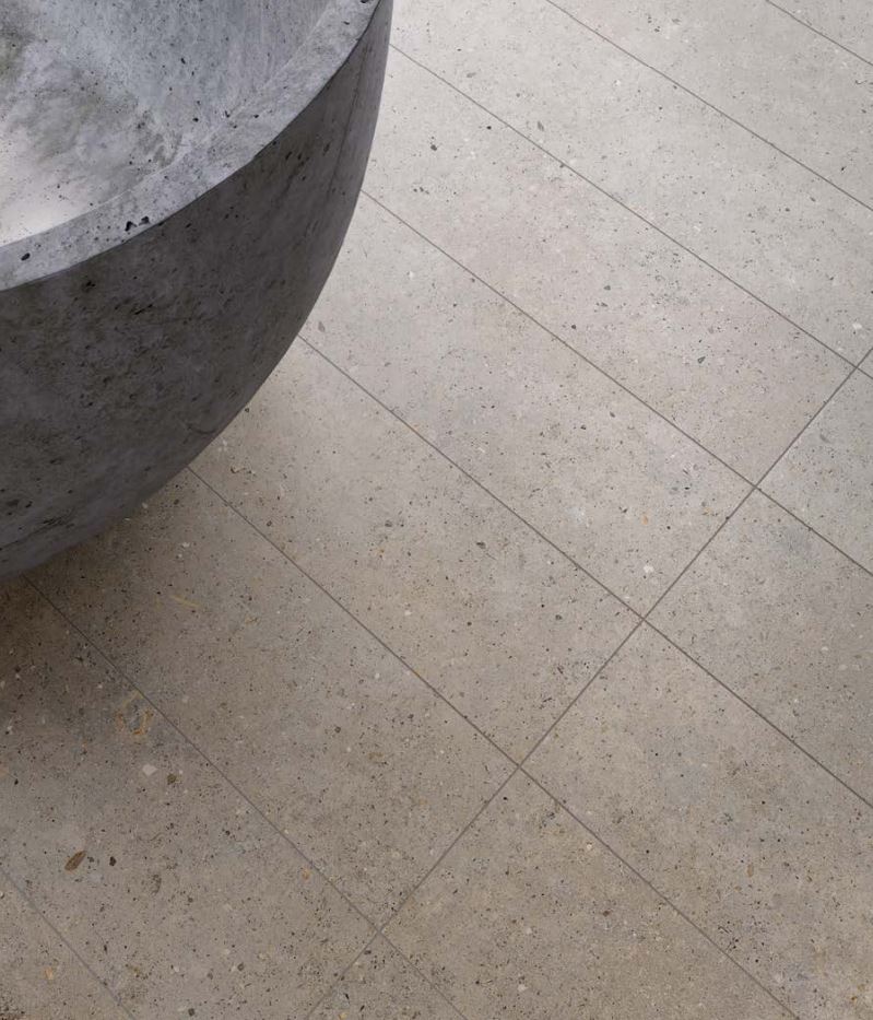 Biophilic er inspireret af støbt beton og derfor er glasuren på flisen lagt, så det ligner der er små sten og andre detaljer i overfladen – præcis ligesom hvis gulvet var støbt beton. Ved at vælge en fuge, som ligger helt tæt op af farven på flisen får man et meget smukt og homogent – dog stadig spændende – gulv.