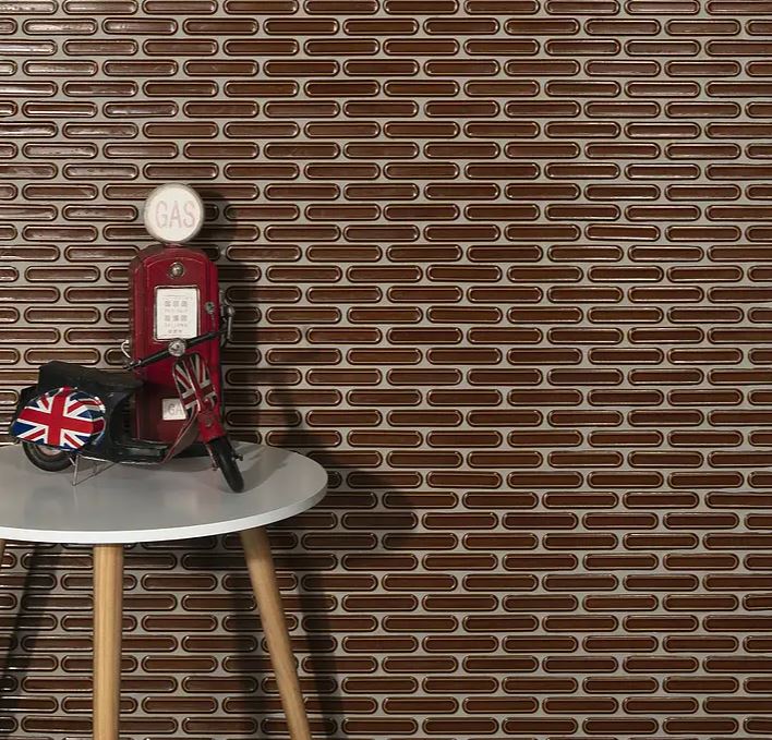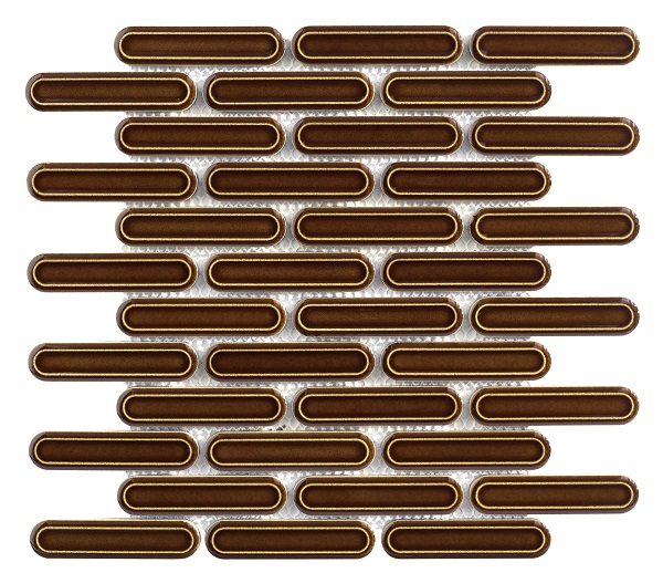Mosaikfliserne består af aflange, ovale elementer med afrundede kanter, der er arrangeret i et forskudt mønster. Den brune farve er varm og indbydende, mens de gyldne detaljer tilføjer et strejf af elegance og luksus.