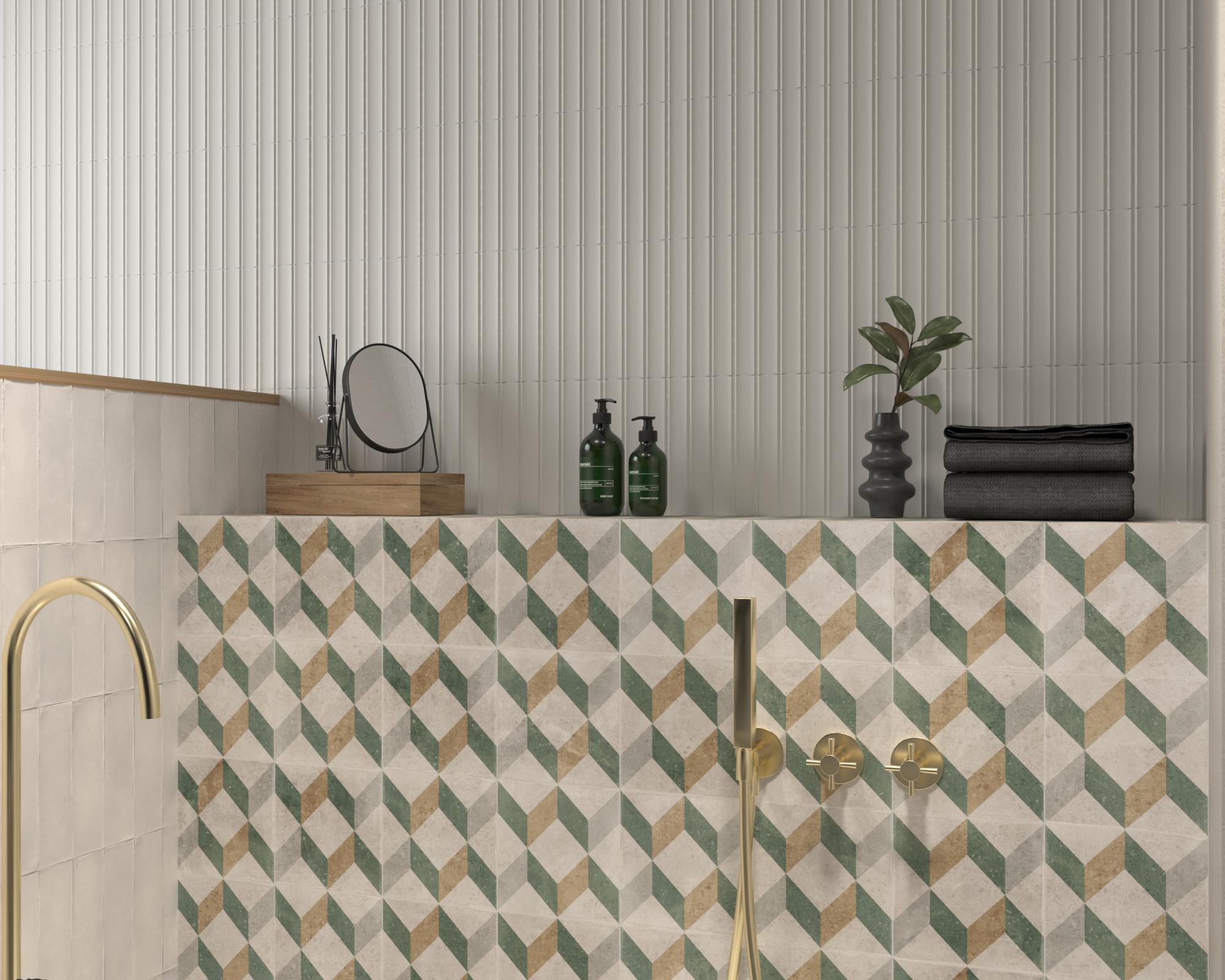 Grazie-fliserne har et detaljeret mosaik-design i en palette af grå, beige og grønne nuancer. Mønsteret er inspireret af klassiske geometriske designs, som skaber et fint sammenhængende mønster.