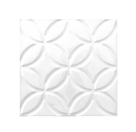 Liso Botanical Blanco Z er en dekorativ hvid flise med en blank overflade og et floralt relief-mønster.