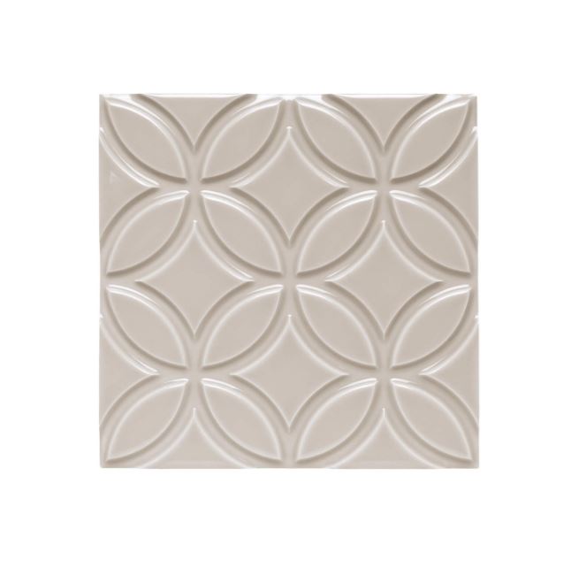 Liso Botanical Sierra Sand er en dekorativ sandgrå flise med en blank overflade og et floralt relief-mønster.