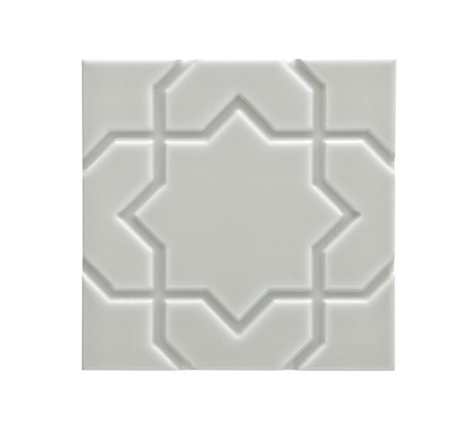 Liso Botanical Silver Mist er en dekorativ lysegrå flise med en blank overflade og et stjerne-inspireret relief-mønster.