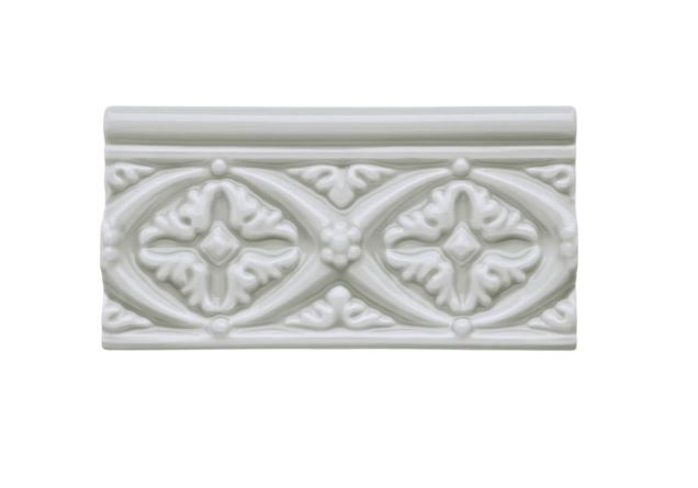 Relieve Bizantino Silver Mist er en dekorativ lysegrå bort-flise med en blank overflade.