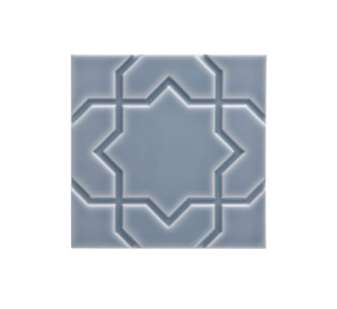 Liso Botanical Storm Blue er en dekorativ flise i en dæmpet gråblå nuance med en blank overflade og et stjerne-inspireret relief-mønster.