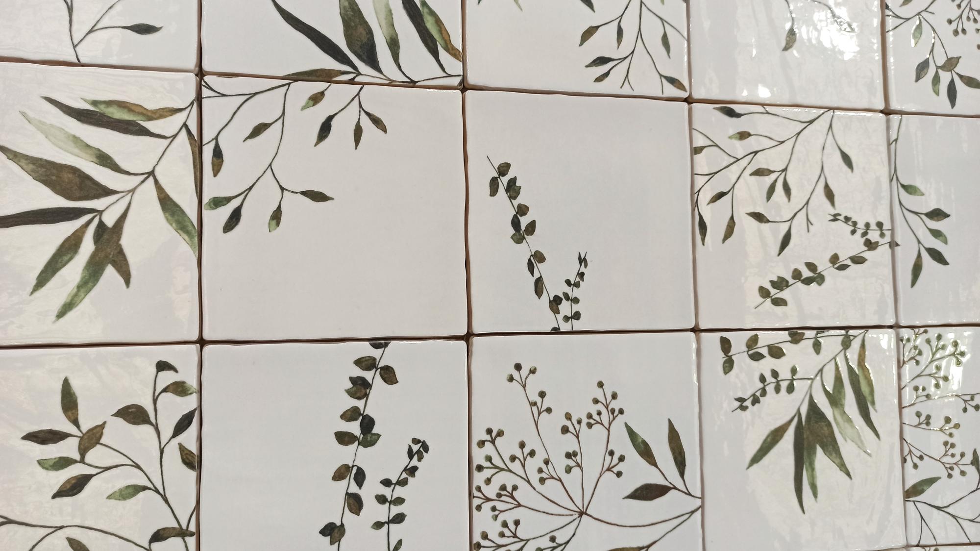 Olivia Verde har en smuk, levende grønt mønster af grene og blade. Overfladen er glansfuld, hvilket tilføjer dybde til farven og reflekterer lyset på flotteste vis.