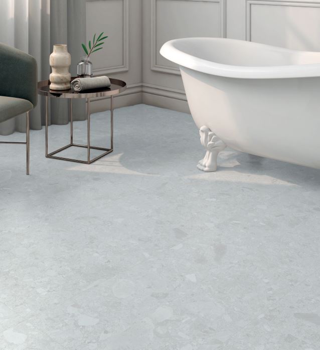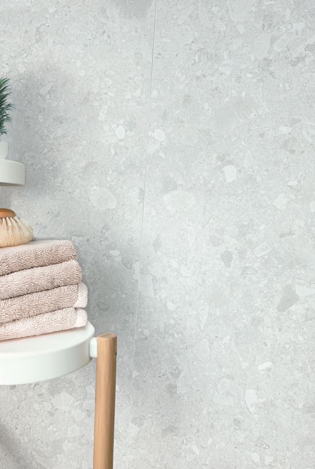 Stone Pearl flisen fanger essensen af Ceppo di Gre med sin elegante blanding af farvetoner og visuelle udtryk. Flisens matte overflade kombineret med de lyse nuancer tilføjer en underspillet elegance og skaber en lys og indbydende atmosfære i dit hjem.