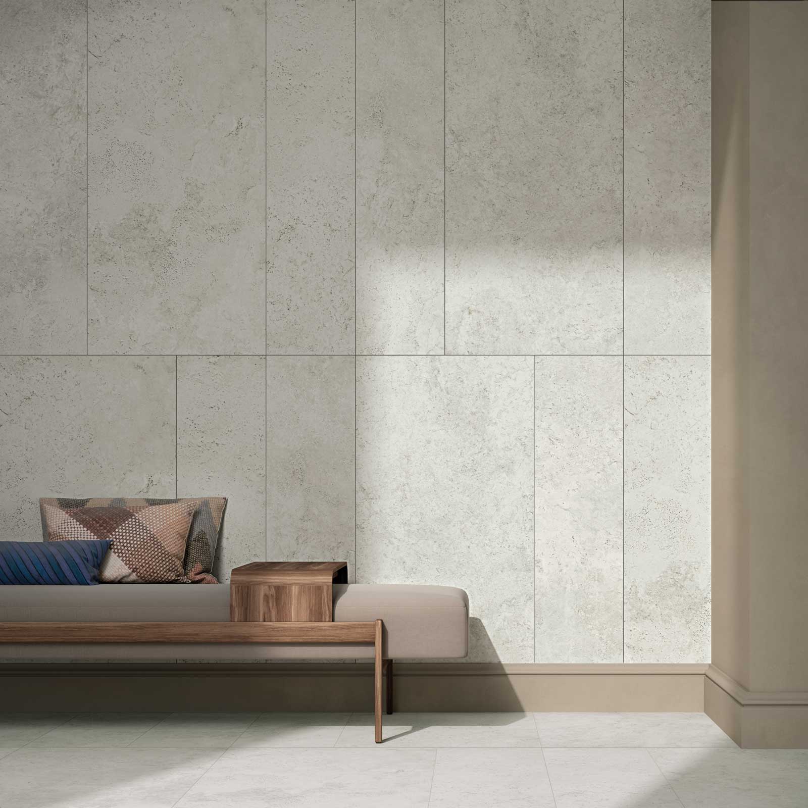 Farven Appia er en lys grå nuance og udtrykket er som når Travertinen er skåret på tværs af årerne.