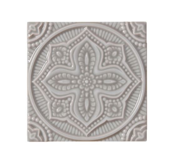 Studio Relieve Mandala Planet er en af seriens mønstrede relief-fliser og den har en lysegrå nuance, der giver et elegant og personligt look. Den lysegrå nuance med den glossy overflade reflekterer lys smukt. Dette gør flisen til et ideelt valg for dem, der ønsker at indrette sig minimalistisk og elegant, hvor farven kan fungere som et lærred for boligens andre designelementer.