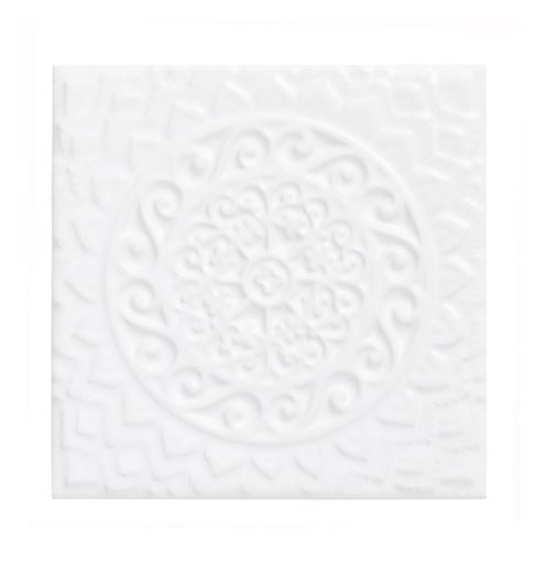 Studio Relieve Mandala Universe er en af seriens mønstrede relief-fliser og den har en kridhvid nuance, der giver et rent og poleret look. Den klare hvide farve med den glossy overflade reflekterer lys smukt, hvilket skaber en følelse af rummelighed og åbenhed i ethvert rum. Dette gør flisen til et ideelt valg for dem, der ønsker at indrette sig minimalistisk og elegant, hvor farven kan fungere som et lærred for boligens andre designelementer.